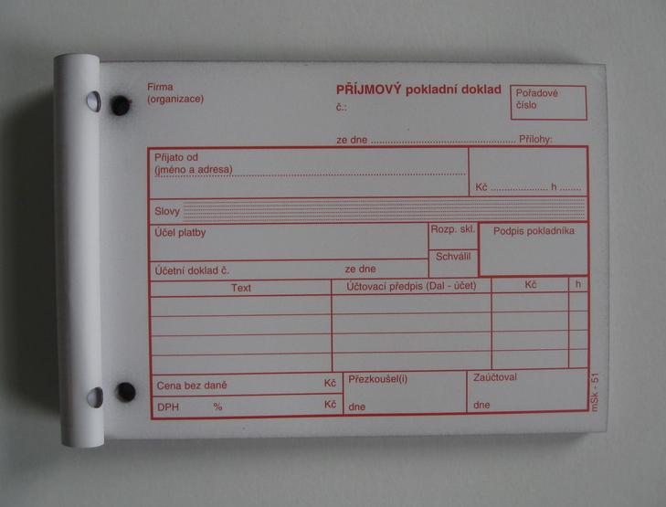 příjmový pokladní doklad s tabulkou, samopropis, nečíslovaný